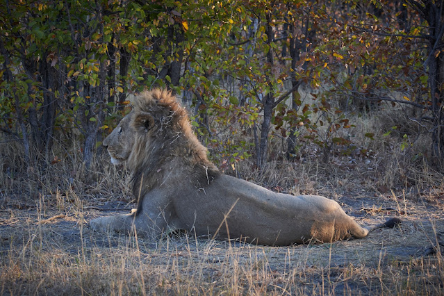 Ve skupině vodušek znamenaných byl bahnivec jižní - další druh do seznamu, ani jsem nedoufal, že je uvidíme.Jeli jsme směrem ke kraji lesa, kde jsme viděli žirafy. Vtom jsme uviděli dva lvy chrápající ve stínu. Byli to dva samci s pěknou světlou hřívou, silní a v nejlepších letech. Váleli se na zádech s packami vytrčenými vzhůru úplně jako Esme. Pak se jeden zvedl a poodešel, povedlo se mi ho přitom natočit.